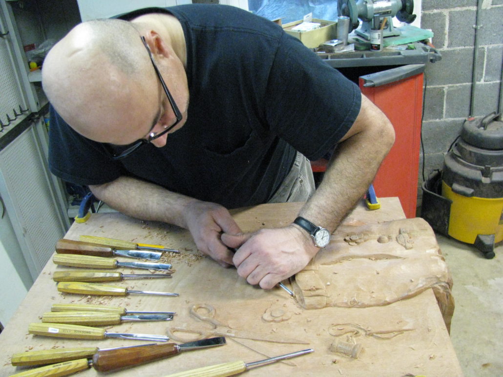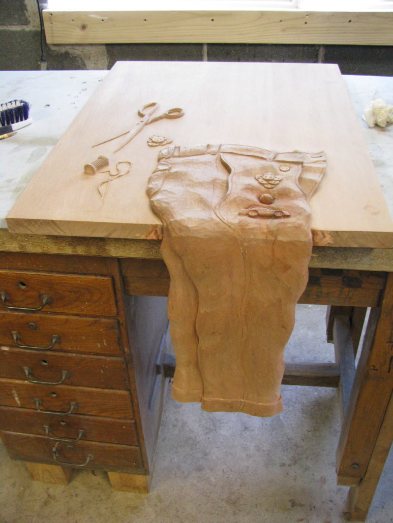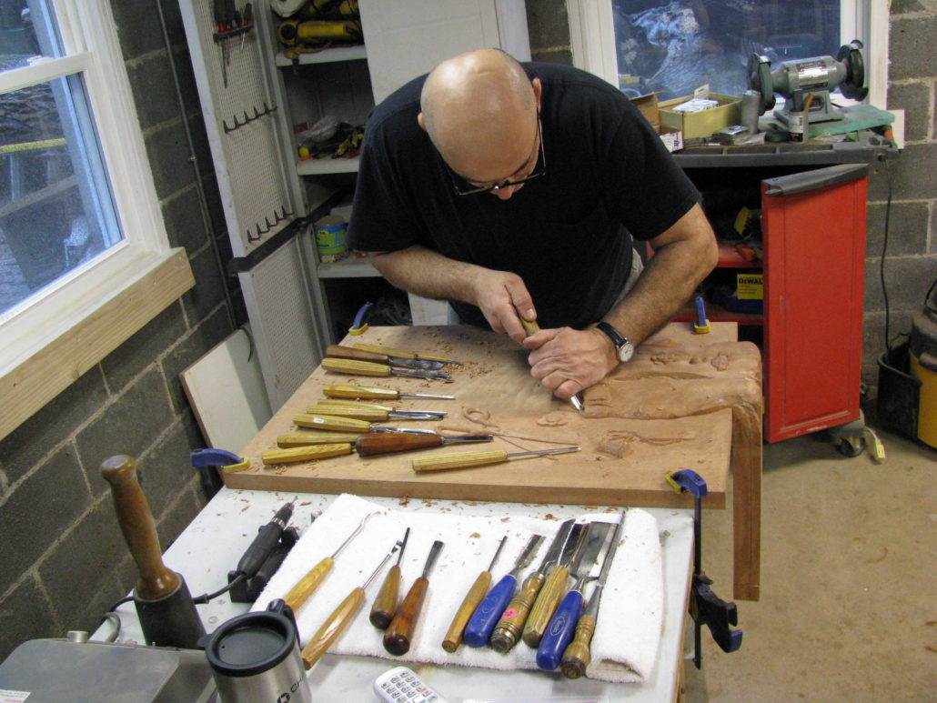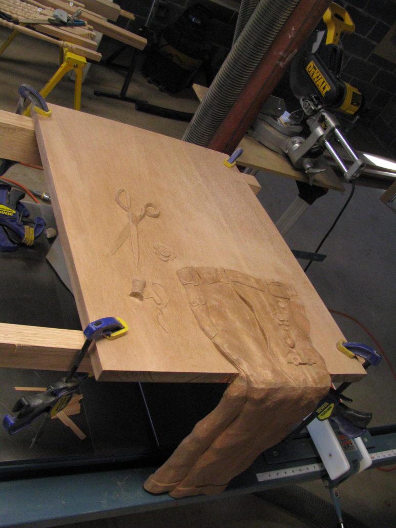 This is a custom carved sewing machine table made from Mahogany wood for Tom Besias in Philadelphia, PA.